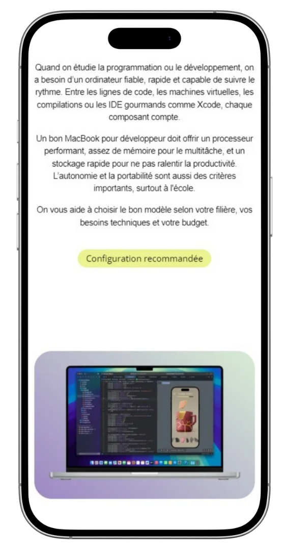 Pour chaque filière, j’ai intégré un texte descriptif des besoins des étudiants et j’ai ajouté des modèles de Mac correspondant à ces critères, afin de pouvoir directement convertir les visiteurs en clients. J’ai ensuite travaillé le format téléphone pour rendre les pages responsive.